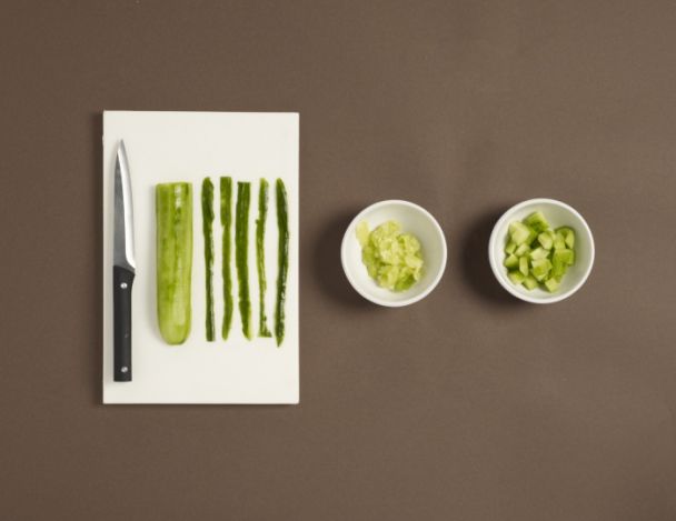 FacileEplucher le concombre, le couper en deux dans le sens de la longueur et épépiner à l’aide d’une cuillère.