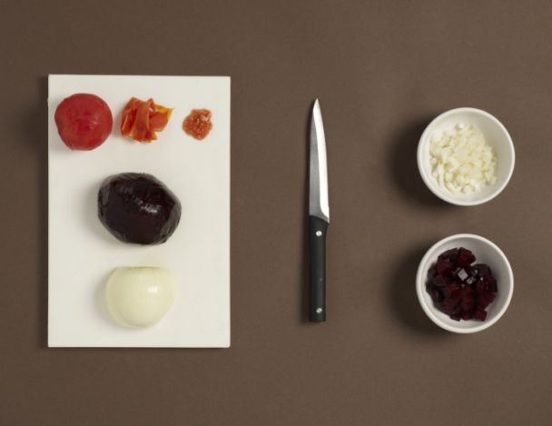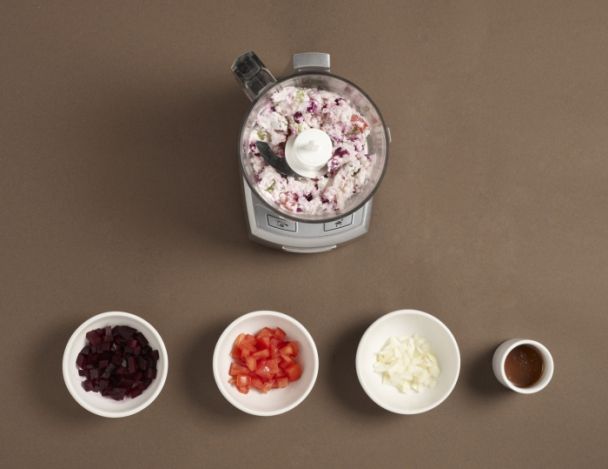 Egoutter le concombre, puis le mélanger au fromage blanc avec les tomates, le poivre, le sel, la betterave et l'oignon puis ajouter du tabasco