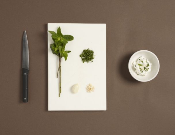 Laver et ciseler la menthe, la mélanger avec le fromage frais.