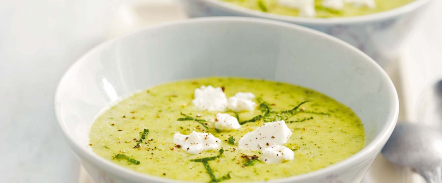 Hors du feu, ajoutez la crème et la moitié de la menthe ciselée. Poivrez légèrement. Passez la soupe au mixeur, laissez-la refroidir, puis réservez-la au frais. Servez dans des bols, avec le fromage de chèvre émietté et le reste de menthe ciselée.
