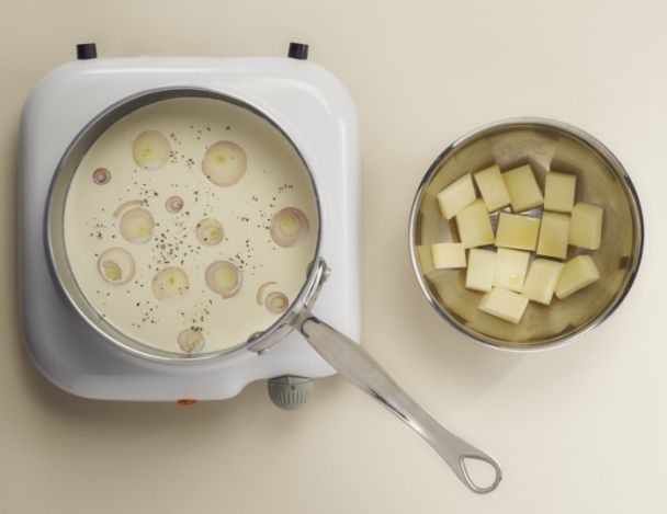 Faire chauffer la crème avec le sel, poivre et l'échalote coupée en rondelles.