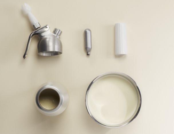Mettre le tout dans un siphon à chantilly contenant une seule cartouche de gaz.