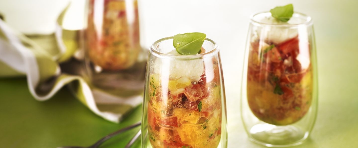 FacileLaver et essuyer les tomates et le poivron. Épépiner et couper en petits dés. Éplucher et émincer les oignons. Rincer, sécher et ciseler le basilic.