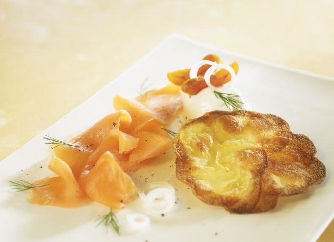 Décorer avec les tomates confites, les câpres à queue ; les olives noires quelques lamelles d'oignon nouveau, des quartiers de citron et des pluches de fines herbes.