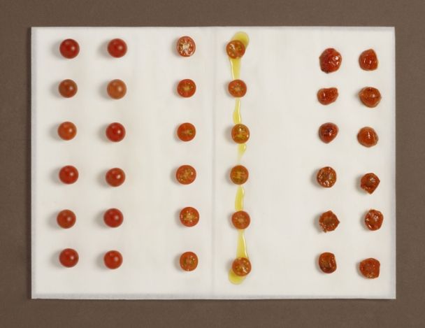MoyenCouper les tomates en deux et les déposer sur une plaque. Arroser d'huile d'olive, ajouter un peu de sel, et de sucre.
