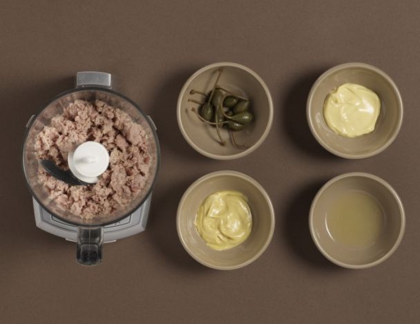 Presser le jus des 3 citrons. Mixer le thon, la mayonnaise, les câpres, la moutarde, et le jus de citron.