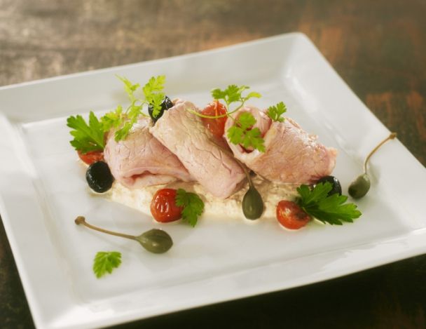 Garnir le fond d'un plat avec la sauce au thon et disposer des tranches de veau.