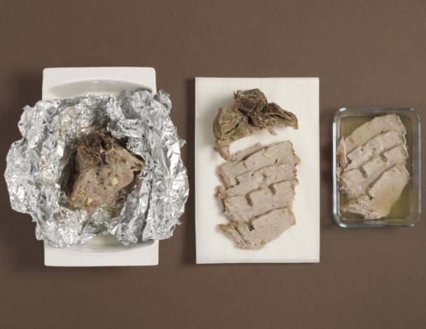 Après refroidissement, couper la viande en très fines tranches, arroser la du jus de cuisson et laisser mariner au frais.