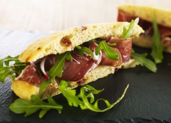 Focaccia aux tomates confites, roquette et jambon ibérique