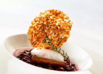 Poêlée de cerises, sorbet et palet croustillant à la fleur de thym