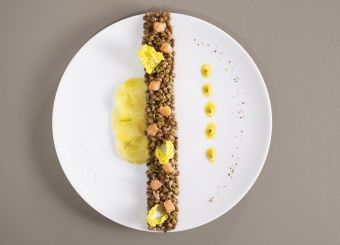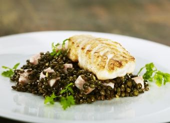 Cabillaud rissolé, lentilles vertes et cubes de Morteau