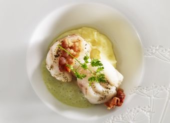Dos de cabillaud à la crème de pomme de terre, émulsion de poireau