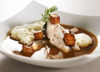 Saint-pierre poché dans une soupe de poisson, pommes de terre, fenouil