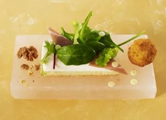 Mesclun et chips de jambon cru sur un sablé à l'Emmental