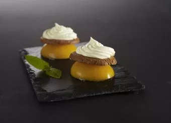 Espuma d’abricot, brisure de nougat, sablé au romarin
